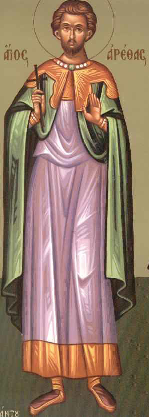 24 Οκτωβρίου … Άγιος Αρέθας ο Μεγαλομάρτυρας και οι σὺν αὐτῶ … Τμηθείς , Θεῷ προσῆξε Μάρτυς Ἀρέθας , Πολλοὺς ὁμοίως Μάρτυρας τετμημένους , Ἀρέθα εἰκάδι σὺν γνωστοῖσι τετάρτῃ τμήθης ... Ήταν από τους π …